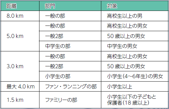 ※ファミリーの部に参加される方は、ファン・ランニングの部、3km部門には出場できません。ファミリーの部を除き、複数の部門への参加はできません。
