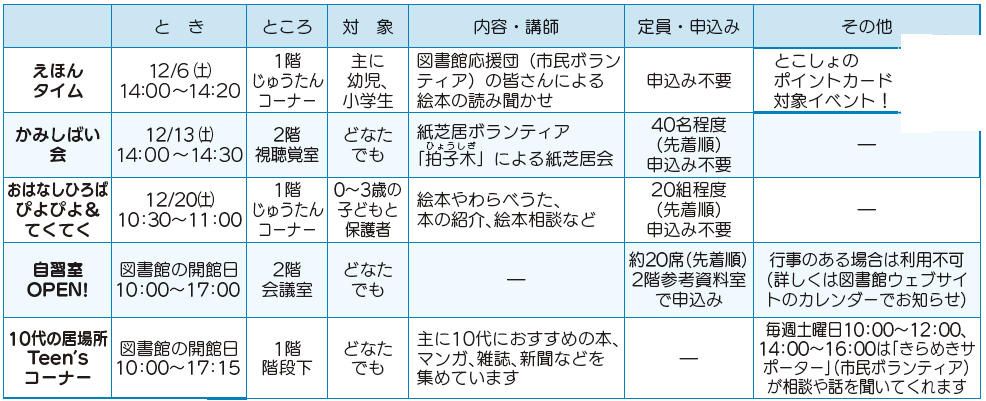 申込み・問合せ:12月6日(土)午前10時から窓口か電話、Eメールで講座名、氏名、年齢、電話番号を図書館へ