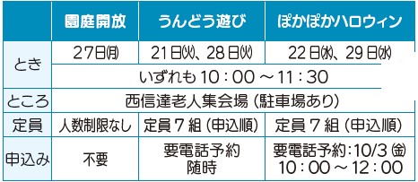 子育て 子育て支援センターぽかぽか10月の予定 26/38 前の記事 次の記事 発行日 : 2025年10月01日 自治体名 : 大阪府泉南市 広報紙名 : 広報せんなん 令和7年10月号 対象:就学前の子どもと保護者 その他:お茶以外飲食不可 申込み・問合せ:西信達くねあ 【電話】483-2444・電話相談随時 Tweet シェアする 子育て情報局-地域子育て支援センターひだまり- 〈予告〉2025年度後期ひまわりキッズ幼児教室