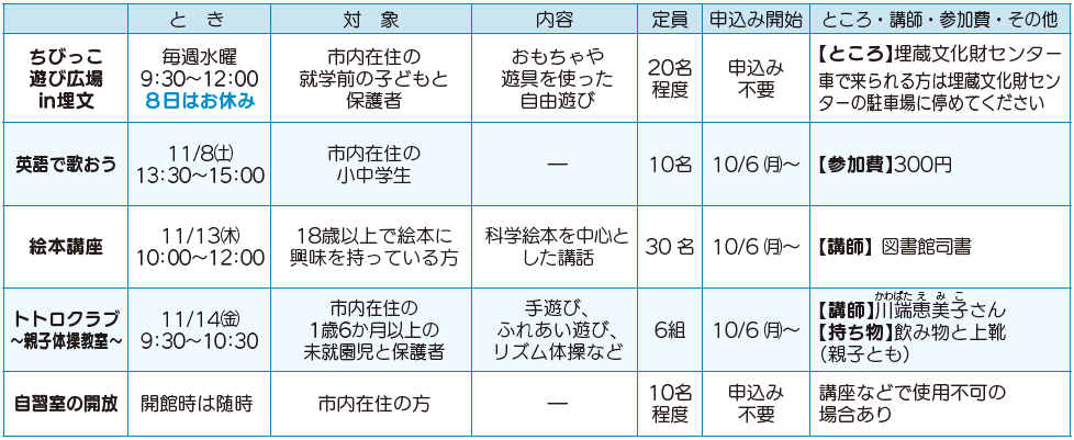 ※定員のあるイベントは申込順(申込み不要なものは先着順)