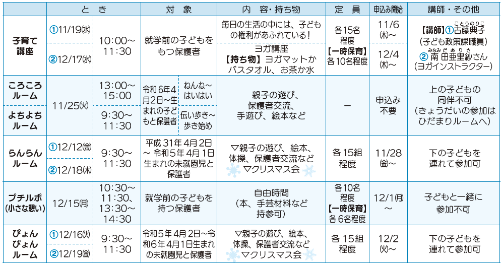日時:祝日を除く月・火・木・金曜日(行事により未開催日あり)午前9時30分~11時40分、午後1時~3時