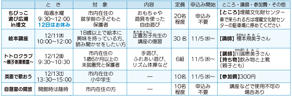 ※定員のあるイベントは申込順(申込み不要なものは先着順)