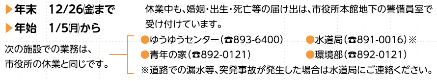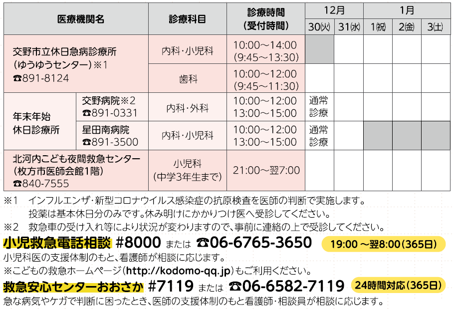 くらし 年末年始の業務案内 3/49 前の記事 次の記事 発行日 : 2025年12月01日 自治体名 : 大阪府交野市 広報紙名 : 広報かたの 2025年12月号 ■市役所の一般業務 ■おりひめバスの運行 ■ごみの収集 ■広報1月号の配布 ■各施設の貸し出し・開館 ■救急医療 Tweet シェアする (特集)もっと身近に!オンライン申請(2) R6年度の決算(1)