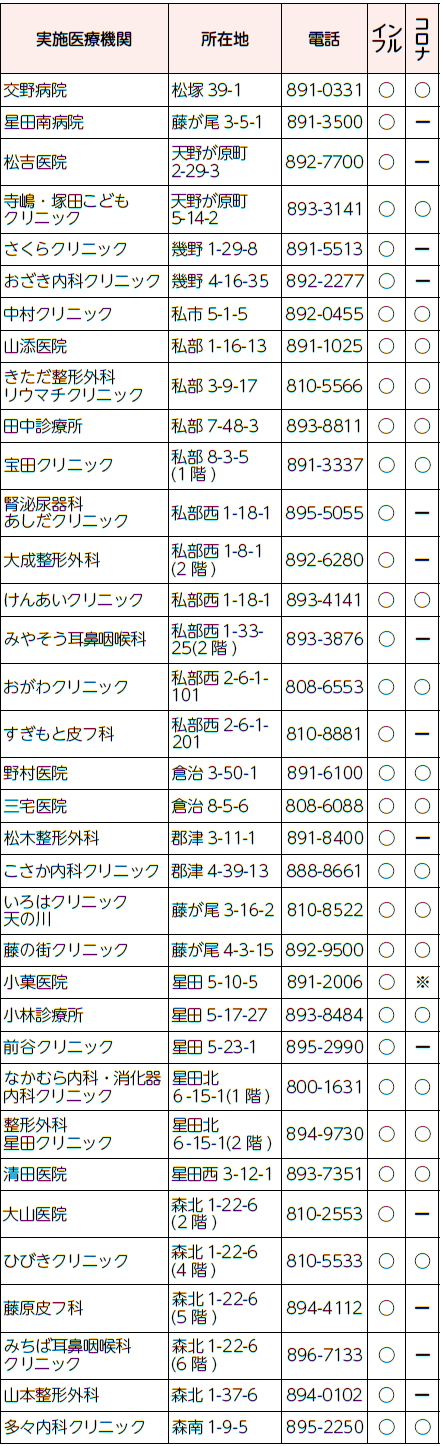 ※入院中等、やむを得ず実施医療機関以外で接種する方は、事前申請が必要です。健康増進課までお問い合わせください。申請がない場合は任意接種で全額自己負担となります。