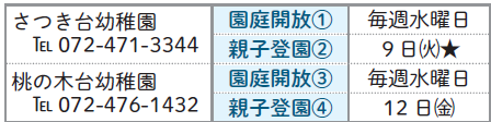 子育て 12月 私立幼稚園 園庭開放・親子登園 23/63 前の記事 次の記事 発行日 : 2025年12月01日 自治体名 : 大阪府阪南市 広報紙名 : 広報はんなん 2025年12月号 時間: (1)10時30分~12時 (2)(3)(4)10時30分~11時30分 ((1)(3)は休みの日があります。来園前にウェブサイトをご確認ください) 対象: (1)(3)(4)未就園児と保護者 (2)来年度入園を希望する子どもと保護者 ※親子登園は要予約。 ※★は、保健師による「すこやか相談」の日です。 Tweet シェアする 12月 公立幼稚園 親子登園・体験入園 12月 保育所・認定こども園 園庭開放
