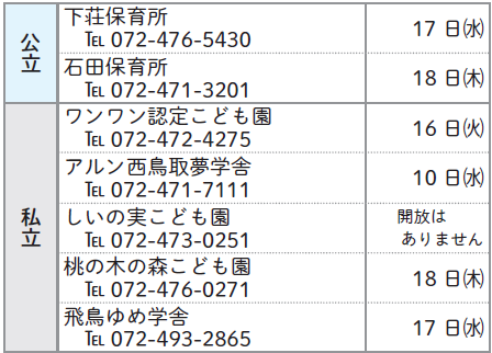 子育て 12月 保育所・認定こども園 園庭開放 24/63 前の記事 次の記事 発行日 : 2025年12月01日 自治体名 : 大阪府阪南市 広報紙名 : 広報はんなん 2025年12月号 時間:10時~11時30分 対象:本市在住の未就園児と保護者 ※申し込み、駐車場や雨天時などは問い合わせください。 Tweet シェアする 12月 私立幼稚園 園庭開放・親子登園 留守家庭児童会(ちびっこホーム)令和8年度 入会募集します