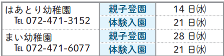 子育て 1月 公立幼稚園 親子登園・体験入園 14/53 前の記事 次の記事 発行日 : 2026年01月01日 自治体名 : 大阪府阪南市 広報紙名 : 広報はんなん 2026年1月号 時間:10時~11時15分 〇親子登園 対象:0~3歳児と保護者(申し込み不要) 〇体験入園 対象:来年度入園を希望する子どもと保護者(申し込み要/当日予約可) Tweet シェアする おやこであそぼうカレンダー 1月 私立幼稚園 園庭開放・親子登園