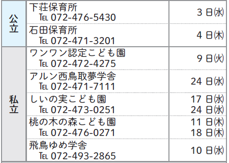 子育て 9月 保育所・認定こども園 園庭開放(無料) 15/57 前の記事 次の記事 発行日 : 2025年09月01日 自治体名 : 大阪府阪南市 広報紙名 : 広報はんなん 2025年9月号 時間:10時~11時30分 対象:本市在住の未就園児と保護者 ※申し込み、駐車場や雨天時などはお問い合わせください。 Tweet シェアする 情報ボックス‐子育て 9月 公立幼稚園 親子登園・体験入園(無料)