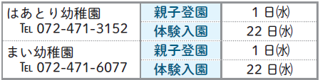 子育て 10月 公立幼稚園 親子登園・体験入園 24/66 前の記事 次の記事 発行日 : 2025年10月01日 自治体名 : 大阪府阪南市 広報紙名 : 広報はんなん 2025年10月号 時間:10時~11時15分 〇親子登園 対象:0~3歳児と保護者(申し込み不要) 〇体験入園 対象:来年度入園を希望する子どもと保護者(申し込み要/当日予約可) Tweet シェアする CHECK「おやこであそぼうカレンダー」 10月 私立幼稚園 園庭開放・親子登園
