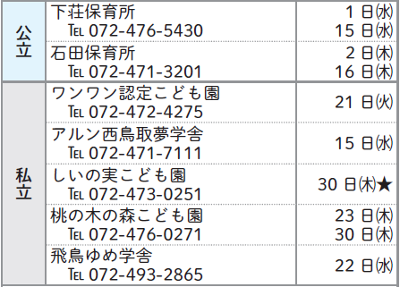 子育て 10月 保育所・認定こども園 園庭開放 26/66 前の記事 次の記事 発行日 : 2025年10月01日 自治体名 : 大阪府阪南市 広報紙名 : 広報はんなん 2025年10月号 時間:10時~11時30分 対象:本市在住の未就園児と保護者 ※申し込み、駐車場や雨天時などは問い合わせください。 ※★は、保健師による相談日です。 Tweet シェアする 10月 私立幼稚園 園庭開放・親子登園 市立幼稚園令和8年度園児募集