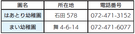 第2次阪南市子育て拠点再構築方針によりまい幼稚園は、令和10年4月に、はあとり幼稚園に統合する予定です。