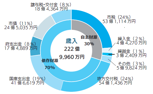 歳入総額は、令和5年度(200億2,577万円)に比べると、11.4%増加し、その増加の主な要因は、学校給食センター改修事業に伴う市債の増加によるものです。