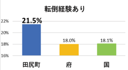 田尻町は大阪府に比べて、転倒経験がある方の割合が高いことが分かっています。