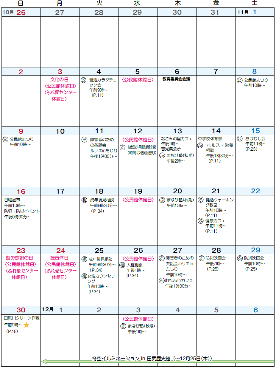 くらし 田尻町令和7年11月行事カレンダー 38/40 前の記事 次の記事 記事を読み上げる 発行日 : 2025年11月01日 自治体名 : 大阪府田尻町 広報紙名 : 広報たじり 2025年11月号 〔略称〕 ふ:ふれ愛センター 公:公民館 相:相談スペースほっ…と 歴:田尻歴史館 ★:たじりっちポイント ※P.○は、広報○ページを参照してください。 Tweet シェアする 無料相談 漁港につづけ 日曜昼市たじりまるごとマーケット