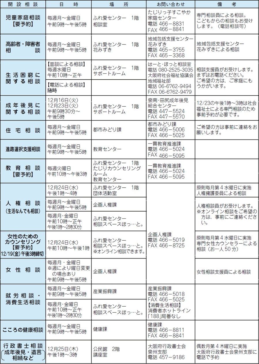 くらし 無料相談 38/41 前の記事 次の記事 記事を読み上げる 発行日 : 2025年12月01日 自治体名 : 大阪府田尻町 広報紙名 : 広報たじり 2025年12月号 各種相談については内容をご確認の上、実施機関までお問い合わせください。 いずれも祝日・年末年始を除く Tweet シェアする 〔ワイドアングル〕関空ニュース 田尻町 令和7年12月 行事カレンダー
