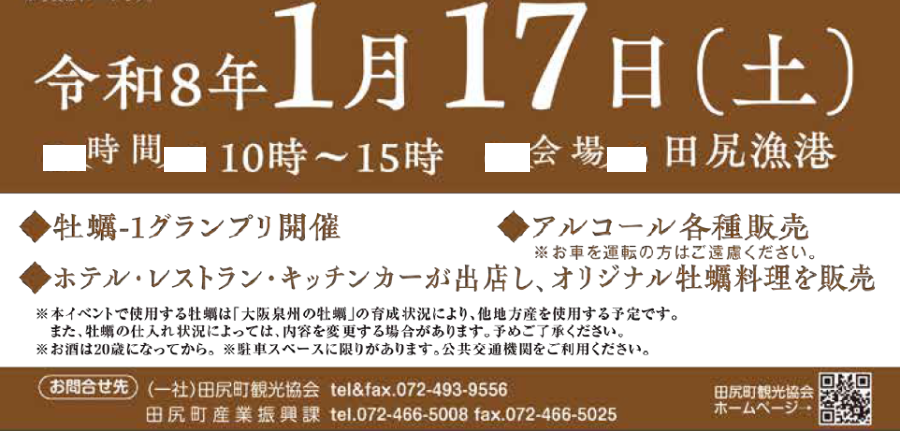 イベント 大阪泉州牡蠣フェスin田尻漁港 41/42 前の記事 次の記事 記事を読み上げる 発行日 : 2026年01月01日 自治体名 : 大阪府田尻町 広報紙名 : 広報たじり 2026年1月号 「大阪泉州牡蠣フェス」で検索 ※詳しくは本紙をご覧ください。 Tweet シェアする 田尻町 令和8年1月 行事カレンダー その他のお知らせ(広報たじり 2026年1月号)