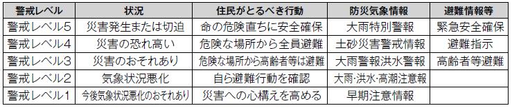 こうした災害時には、的確な避難行動をとることができるよう、避難に関する情報や防災気象情報などの防災情報が5段階の「警戒レベル」で発表されます。
