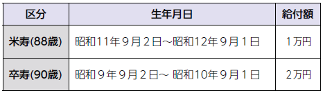 くらし 長寿のお祝い!~敬老祝金をお届けします~ 20/33 前の記事 次の記事 発行日 : 2025年09月01日 自治体名 : 大阪府河南町 広報紙名 : 広報かなん 令和7年9月号 長寿を祝して、敬老祝金を9月末ごろに現金書留で郵送します。 対象:9月1日時点で町に住所があり、居住している人 ※申請は不要です。 問い合わせ:高齢障がい福祉課高齢福祉係 Tweet シェアする 楽しく学ぼう!消防イベント 町の情報-福祉、税、環境・衛生-