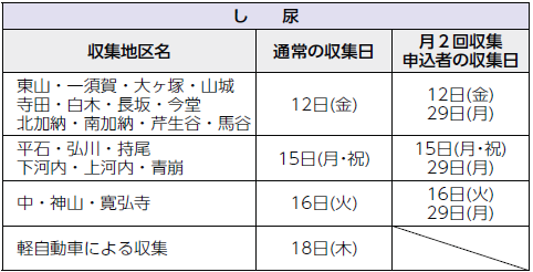※し尿の収集日は、天候などにより変更する場合があります。また、土・日曜日、祝日の臨時汲み取りはできません。