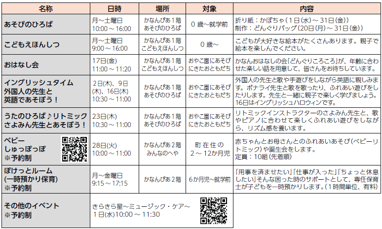 子育て おやこ園 10月のスケジュール 25/27 前の記事 次の記事 発行日 : 2025年10月01日 自治体名 : 大阪府河南町 広報紙名 : 広報かなん 令和7年10月号 ※保育士が子育ての相談に応じます。気軽に来てください。祝日は休みます。 問い合わせ:おやこ園(子育てセンター・かなんぴあ内) Tweet シェアする 町の情報-安全安心、健康保険、学校、子育て、その他- いざ、国勢調査!