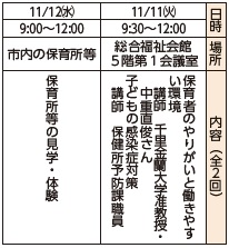 申し込み:10月30日(木)までに、ウェブサイトで必要事項と一時保育(1歳6カ月~就学前の幼児。要相談)の有無を幼保連携政策課へ。1日のみの参加も可能