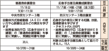 申し込み:いずれも電話、ウェブサイトで必要事項を救急課へ