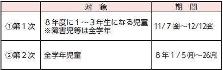 申請方法など:各放課後児童クラブやこども総務課(市役所2階)に備え付けの利用許可申請書(兼児童台帳)と就労証明書、誓約書等を在学・入学予定の放課後児童クラブかこども総務課へ持参。申請書類はウェブサイトにも掲載します。(1)は2月中旬(2)は3月中旬に結果を郵送します