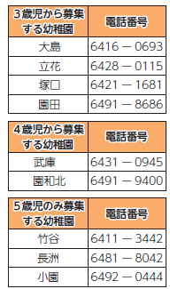 申込み:10月1日~7日午後2時30分~4時30分(土・日曜日を除く)に直接入園を希望する各園。なお、市立幼稚園の併願はできないため、申し込みは1園に限ります。