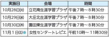 申込み:10月6日から各実施日の前日までに電話かファクス(住所、氏名、電話番号を書いて)、専用フォームで公共施設戦略課。手話通訳あり。
