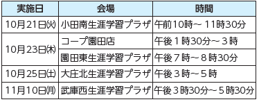 申込み:10月6日から各実施日の前日までに電話か専用フォームで各会場
