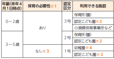 対象:来年4月から保育所などでの保育を希望する人で、子ども・子育て支援新制度の下で、2号認定か3号認定を受ける人。認定を受けるには、保育の必要性の事由に該当することが必要です