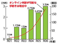 オンライン申請が可能な手続きは、住民票の写しの交付申請や産後ケア事業の利用申請など186項目あり、今後も拡大予定です。昨年度は約3万件を受け付けました。