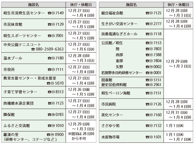 くらし 年末年始の公共施設休館日一覧表 12/31 前の記事 次の記事 発行日 : 2025年12月01日 自治体名 : 兵庫県相生市 広報紙名 : 広報あいおい 令和7年(2025年)12月号 Tweet シェアする 相生市からの情報 Aioi city information ~お知らせ「暮らし」 図書館休館期間の延長について
