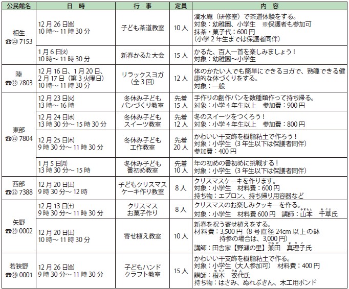 講座 相生市からの情報 Aioi city information ~お知らせ「公民館だより」 18/31 前の記事 次の記事 発行日 : 2025年12月01日 自治体名 : 兵庫県相生市 広報紙名 : 広報あいおい 令和7年(2025年)12月号 工夫を凝らした様々な講座を行っています。地域を問わずご参加ください。 ※受講無料。 申し込み:12月5日(金)から公民館へ。定員になり次第締切。 Tweet シェアする 相生市からの情報 Aioi city information ~お知らせ 扶桑電通なぎさホール ~自主事業情報~