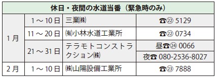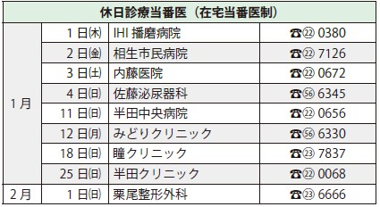 くらし 休日・夜間の水道当番(緊急時のみ)、休日診療当番医(在宅当番医制) 21/29 前の記事 次の記事 発行日 : 2026年01月01日 自治体名 : 兵庫県相生市 広報紙名 : 広報あいおい 令和8年(2026年)1月号 (注)水道メーターから宅内は有料 (注)9時から17時までで急病患者に限ります。 Tweet シェアする 扶桑電通なぎさホール ~自主事業情報~ 冬でも起こる ”かくれ脱水”
