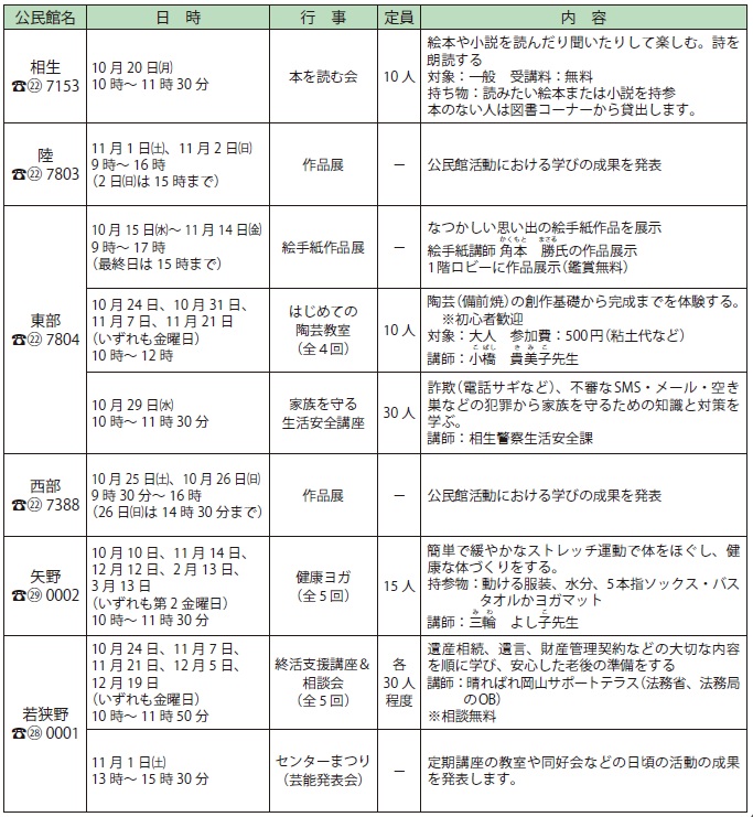 講座 相生市からの情報 Aioi city information ~お知らせ「公民館だより」 22/34 前の記事 次の記事 発行日 : 2025年10月01日 自治体名 : 兵庫県相生市 広報紙名 : 広報あいおい 令和7年(2025年)10月号 工夫を凝らした様々な講座を行っています。地域を問わずご参加ください。 ※受講無料。申し込み10月6日(月)から公民館へ。定員になり次第締切。 Tweet シェアする 相生市からの情報 Aioi city information ~お知らせ「スポーツ」 手話を知ろう