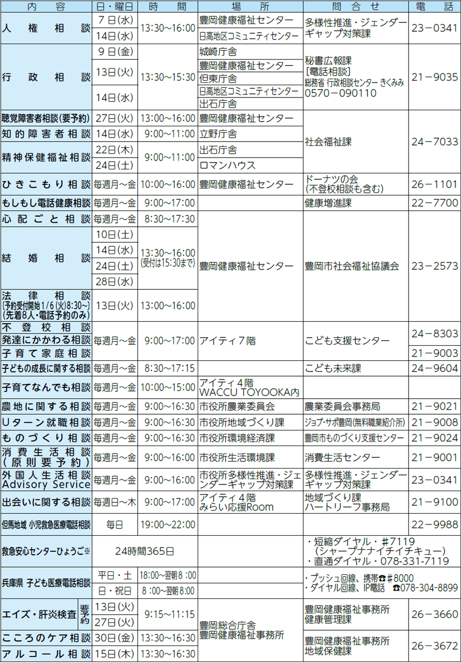 くらし 1月の主な相談 35/42 前の記事 次の記事 発行日 : 2025年12月25日 自治体名 : 兵庫県豊岡市 広報紙名 : 広報とよおか 2026年1月号 ※…救急車を呼ぶべきか迷った時や、どの医療機関をいつ受診すればよいか分からない時に、24時間365日、相談無料(通話料自己負担)でいつでも受け付ける短縮ダイヤル ※毎週の相談日は、祝・休日を除く Tweet シェアする 出張版★子育てなんでも相談室 くらしの情報ー相談ー