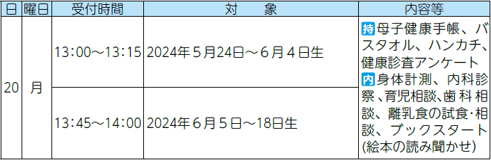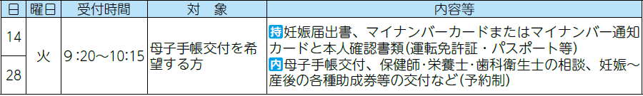 ※上記日程で都合の悪い方は、問合せ先に相談してください。母子手帳交付、保健師の相談、助成券交付のみ、(1)本庁舎等 平日 15:15~16:00、(2)各振興局保健師駐在日等で調整します。