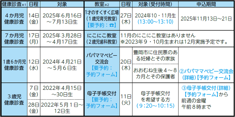 (4か月児健康診査は12:45〜13:00、その他の健康診査は13:00〜13:15で案内)