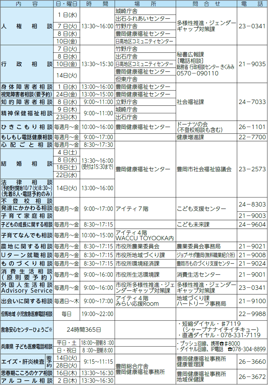 くらし 10月の主な相談 37/44 前の記事 次の記事 発行日 : 2025年09月25日 自治体名 : 兵庫県豊岡市 広報紙名 : 広報とよおか 2025年10月号 ※…救急車を呼ぶべきか迷った時や、どの医療機関をいつ受診すればよいか分からない時に、24時間365日、相談無料(通話料自己負担)でいつでも受け付ける短縮ダイヤル ※毎週の相談日は、祝・休日を除く Tweet シェアする 出張版★子育てなんでも相談室 くらしの情報ー相談(1)ー