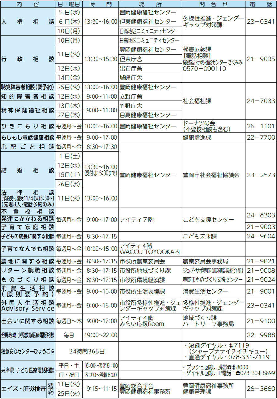 くらし 11月の主な相談 44/51 前の記事 次の記事 発行日 : 2025年10月25日 自治体名 : 兵庫県豊岡市 広報紙名 : 広報とよおか 2025年11月号 ※…救急車を呼ぶべきか迷った時や、どの医療機関をいつ受診すればよいか分からない時に、24時間365日、相談無料(通話料自己負担)でいつでも受け付ける短縮ダイヤル ※毎週の相談日は、祝・休日を除く Tweet シェアする 出張版★子育てなんでも相談室 くらしの情報ー相談(1)ー