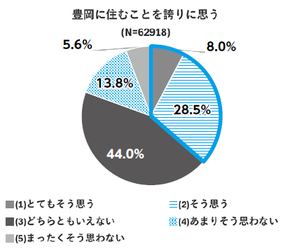 「豊岡市に住むことを誇りに思う」と答えた市民は、4割弱にとどまりました。この結果からは、地域の魅力が十分に感じられていないことや、日常生活の中で、その魅力に触れる機会が限られていることがうかがえます。