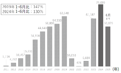 ▽豊岡市外国人観光客延べ宿泊者数の推移(単位…人泊)