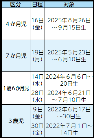 ※1…健康診査の受付時間は(1)の各健康診査のページで確認してください。(4か月児健康診査は12:45〜13:00、その他の健康診査は13:00〜13:15)