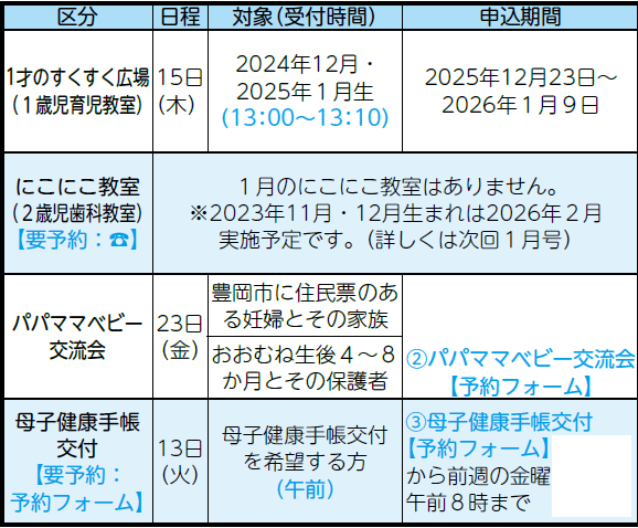 (1)乳幼児健康診査、1才のすくすく広場にこにこ教室