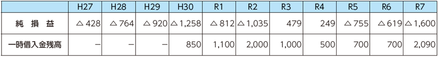 上記1、2のほか、人件費の上昇や物価高騰の影響もあり、新型コロナウイルス関連の補助金があった令和3、4年度以外は赤字が発生し、平成30年度からは一時借入金の借入が続いています。