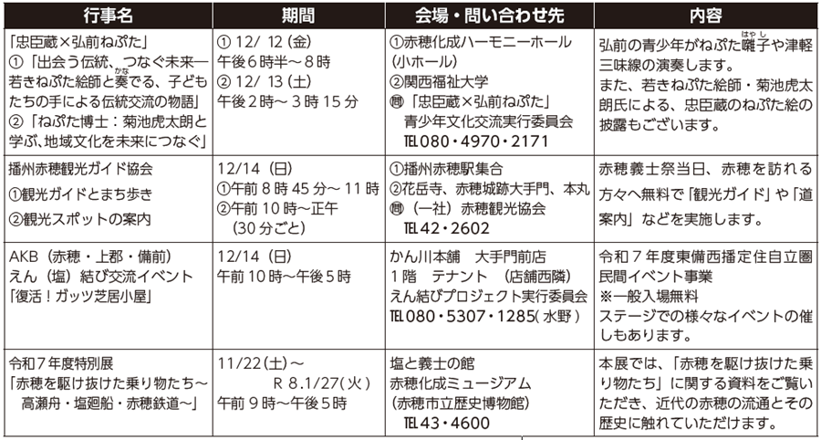 12月14日(日)は、義士追慕の大祭(大石神社)、法要(花岳寺)、各武道大会(品川リフラ赤穂市民総合体育館)など、市内各所で関連行事が開催されます。