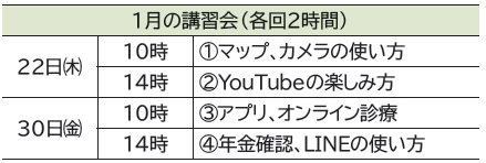 申込み:はがきまたはファクスで、〒住所、名前、生年月日(同一世帯から複数参加の場合は全員分)、電話番号、希望の講座番号(複数受講可)を記入し、〒665-8665(住所不要)情報政策課「スマホ講習会係」へ。12月15日(月)必着