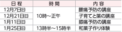 日時:12月1日(月)・11日(木)・15日(月)・18日(木)10時半~11時50分