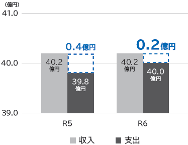 令和6年度は収入が約40.2億円、支出が約40.0億円となり、収支は約0.2億円の黒字となりましたが、前年度より金額は減少しました。